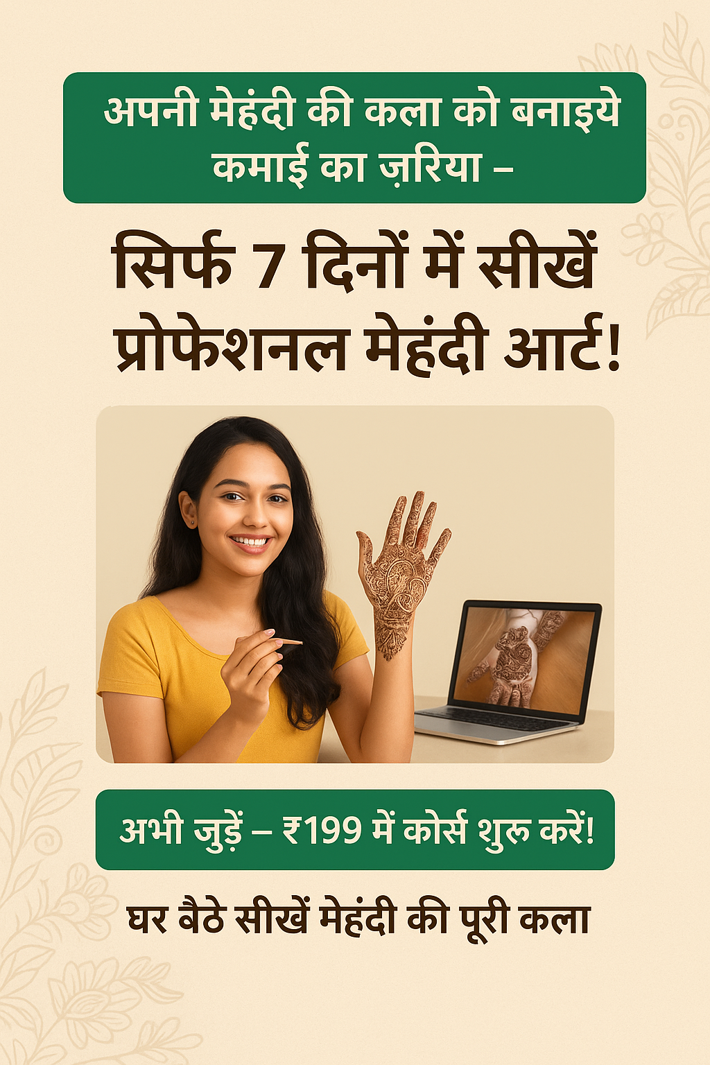 рд╕рд┐рд░реНрдлрд╝ 7 рджрд┐рдиреЛрдВ рдореЗрдВ рдмрдиреЗрдВ рдкреНрд░реЛрдлреЗрд╢рдирд▓ рдореЗрд╣рдВрджреА рдЖрд░реНрдЯрд┐рд╕реНрдЯ тАУ рдШрд░ рдмреИрдареЗ рд╕реАрдЦреЗрдВ рдореЗрд╣рдВрджреА рдХреА рдкреВрд░реА рдХрд▓рд╛ Basic рд╕реЗ Advance рддрдХ!